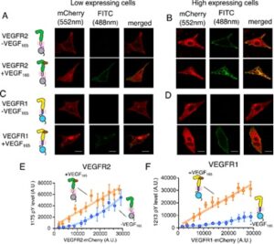 चित्र 1: वीईजीएफआर के लिगैंड-स्वतंत्र सक्रियण की जांच। ए–डी कम (ए, सी) और उच्च (बी, डी) अभिव्यक्त सीएचओ सेल लाइनों में एमचैरी से जुड़े वीईजीएफआर2 या वीईजीएफआर1 की कॉन्फ़ोकल छवियाँ। वीईजीएफआर का अभिव्यक्ति स्तर लाल रंग में है, और फॉस्फोराइलेशन स्थिति हरे रंग में है, स्केल बार = 10यूएम । वीईजीएफआर 2 (पैनल ई) या वीईजीएफआर1 (पैनल एफ) के अभिव्यक्ति स्तर को सी-टर्मिनल टेल पर संबंधित टायरोसिन अवशेषों के फॉस्फोराइलेशन स्तर के विरुद्ध प्लॉट किया गया है.