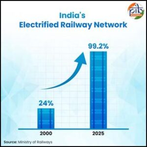 विद्युतीकरणवर्ष2004 और 2014 के बीच लगभग 1.42 किलोमीटर प्रति दिन से बढ़कर 2019 और 2025 के बीच औसतन 15 किलमीटर प्रतिदिन से अधिक हो गया हैविद्युतीकरण की यह गति एक परिवर्तनकारी बदलाव को रेखांकित करती है कि नेटवर्क का कितनी तजी से आधुनिकीकरण किया जा रहा है। विद्युतीकृत ट्रैक हिस्सेदारी 2000 में 24 प्रतिशत से बढ़कर 2017 में 40 प्रतिशत हो गई, और 2024 के अंत में 96 प्रतिशत को पार कर गई। आज एक सदी लंबी यह यात्रा समापन के करीब पहुंच रही है। नवंबर 2025 तक, भारतीयरेल ने अपने रेलवे नेटवर्क के लगभग 99.2 प्रतिशत को कवर करतेहुए प्रभावशाली 69,427 आरकेएम का विद्युतीकरण किया है।इसमें से 46,900 आरकेएम का विद्युतीकरण 2014 और 2025 के बीच किया गया है।
