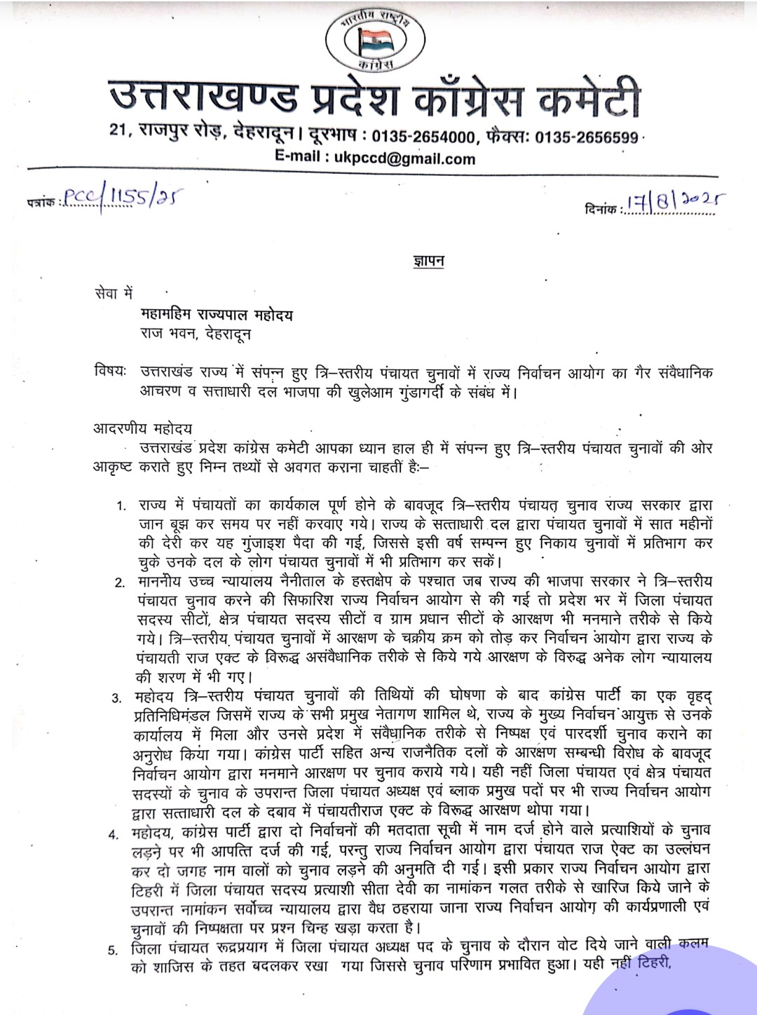 कांग्रेस नेताओं ने राज्यपाल को बताया कि पंचायत चुनावों में देरी कराई गई ताकि नगर निकायों के मतदाता भी इन चुनावों में शामिल हो सकें। साथ ही, जिला पंचायत सदस्य और क्षेत्र पंचायत सदस्य पदों के आरक्षण में नियमों की खुलेआम अनदेखी की गई। नैनीताल, बेतालघाट और रुद्रप्रयाग की घटनाओं का हवाला देते हुए कांग्रेस ने कहा कि चुनाव के दौरान अपहरण, गोलीबारी जैसी घटनाएँ हुईं और प्रशासन मूकदर्शक बना रहा।