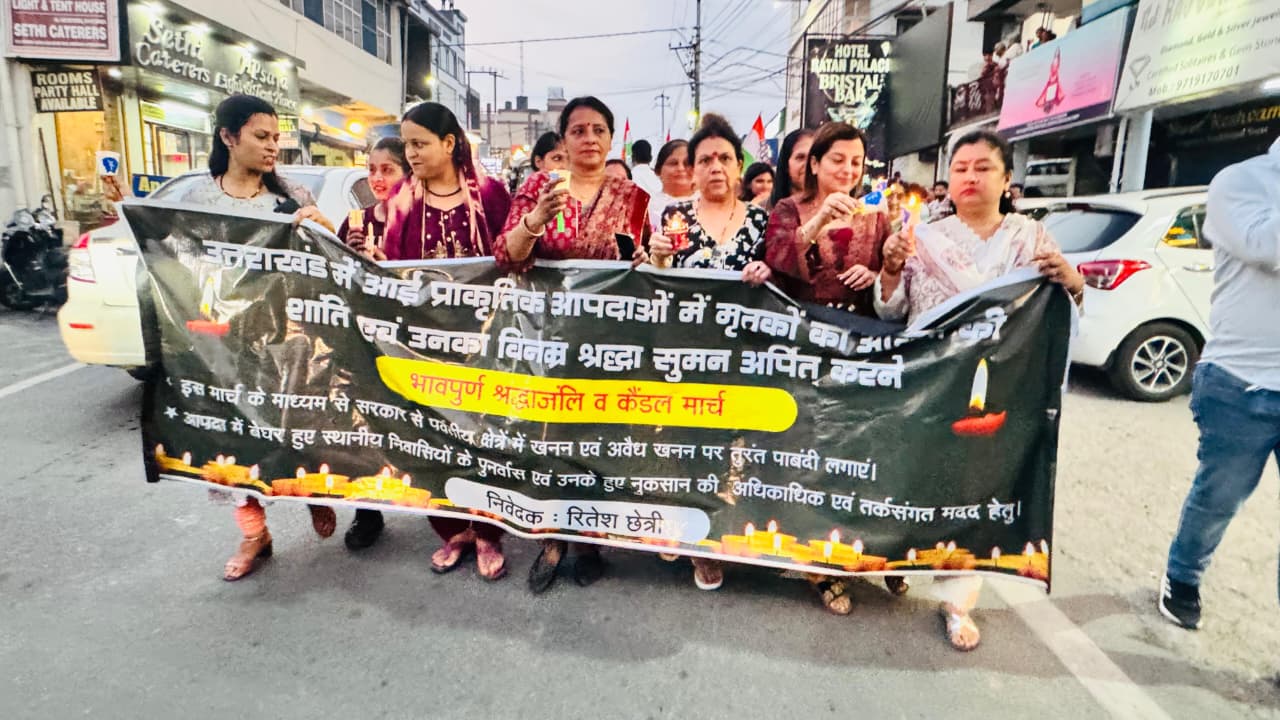 देहरादून, 4 अक्टूबर। उत्तराखंड में हाल ही में आई भीषण प्राकृतिक आपदाओं में दिवंगत हुए लोगों की आत्मा की शांति के लिए आज राजेंद्र नगर से किशन नगर चौक तक कैंडल मार्च निकाला गया। इस श्रद्धांजलि मार्च का आयोजन युवा कांग्रेस के रितेश छेत्री एवं उनके सहयोगियों द्वारा किया गया, जिसमें बड़ी संख्या में स्थानीय नागरिकों, युवाओं एवं समाजसेवियों ने भाग लिया।