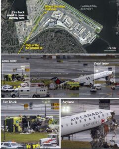 Images show the Air Canada plane’s nose mostly sheared off from the impact of the crash, and an overturned fire rescue truck nearby.