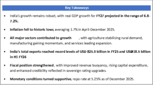 A strong agricultural performance has bolstered rural incomes and consumption, while improvements in urban demand- supported by tax rationalisation measures indicate a broadening of the consumption base. India’s potential growth is estimated at around 7%, with real GDP growth for FY27 projected in the range of 6.8-7.2%, reflecting sustained medium-term growth capacity amid a challenging global environment.