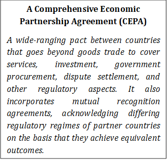 A wide-ranging pact between countries that goes beyond goods trade to cover services, investment, government procurement, dispute settlement, and other regulatory aspects. It also incorporates mutual recognition agreements, acknowledging differing regulatory regimes of partner countries on the basis that they achieve equivalent outcomes. The Comprehensive Economic Partnership Agreement (CEPA) between India and Oman marks a meaningful step forward in the economic relationship between the two countries. The agreement brings together trade in goods and services, investment, professional mobility, and regulatory cooperation under a single, coherent framework aimed at deepening bilateral economic integration.