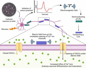 चित्र: g-C3N4 प्रेरित तंत्रिका विभेदन और नेटवर्क निर्माण की हमारी प्रस्तावित क्रियाविधि का आरेख। तंत्रिका कोशिकाएं विश्राम झिल्ली विभव (-90 mV) से क्रिया विभव (+55mV) से गुजरती हैं।