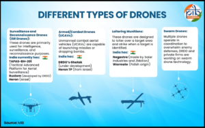 - रक्षा में ड्रोन: ड्रोन भारत की रक्षा में महत्वपूर्ण भूमिका निभाते हैं, सशस्त्र बलों को सीमाओं पर नजर रखने, खुफिया जानकारी इकट्ठा करने और सटीक हमले करने में मदद करते हैं। ऑपरेशन सिन्दूर के दौरान, भारतीय ड्रोन ने दुश्मन के ठिकानों को सुरक्षित और सटीकता से नष्ट कर दिया। महत्वपूर्ण बुनियादी ढांचे की सुरक्षा और खतरों पर तुरंत प्रतिक्रिया देने के लिए ड्रोन वायु रक्षा प्रणालियों, रडार नेटवर्क और कमांड सेंटरों के साथ मिलकर काम करते हैं।