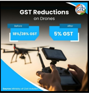 - ड्रोन पर जीएसटी: सितंबर 2025 में ड्रोन पर जीएसटी को घटाकर एक समान 5% कर दिया गया था। पहले 18% और 28% की कर दरों को हटा दिया गया था। यह सरलीकृत कराधान ड्रोन के व्यापक वाणिज्यिक और व्यक्तिगत उपयोग का समर्थन करता है। नेक्स्टजेन जीएसटी सुधार ड्रोन पायलट प्रशिक्षण के लिए उपयोग किए जाने वाले उड़ान और गति सिमुलेटर पर भी लागू होता है। इससे प्रशिक्षण संस्थानों की लागत कम होगी और ड्रोन पारिस्थितिकी तंत्र में कौशल विकास को और मजबूती मिलेगी।