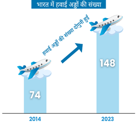 - देश में 50 नए हवाई अड्डों, हेलीपोर्ट व जल हवाई अड्डों के विकास और संचालन के लिए 2023-24 बजट में एक हजार करोड़ रुपये आवंटित किए गए