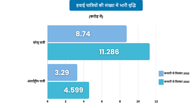 - जनवरी से सितंबर 2022 तक, घरेलू हवाई जहाजों से लगभग 8 करोड़ 74 लाख यात्रियों ने सफर किया, जबकि 2023 में इसी अवधि के दौरान 11 करोड़ 28 लाख से अधिक यात्रियों ने हवाई यात्राएं की, जो कि 29.10% अधिक है।
