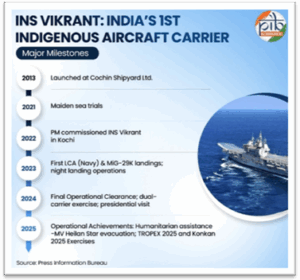 • ऑपरेशन सिंदूर: ऑपरेशन सिंदूर के दौरान विक्रांत वाहक जहाज भारतीय नौसेना की आक्रामक निवारक स्थिति के केंद्र में था। उत्तरी अरब सागर में तैनात विक्रांत ने विशिष्ट रणनीति में महत्वपूर्ण भूमिका निभाई, जिससे पाकिस्तानी नौसेना को रक्षात्मक मुद्रा में आने और तत्काल युद्धविराम का अनुरोध करने पर मजबूर होना पड़ा।