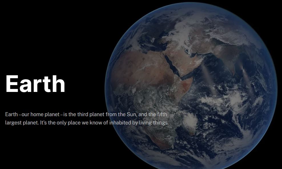 पृथ्वी – हमारा घरेलू ग्रह – सूर्य से तीसरा ग्रह है और सौर मंडल का पाँचवाँ सबसे बड़ा ग्रह है। यह एकमात्र ज्ञात स्थान है जहाँ जीवित प्राणी निवास करते हैं।हालांकि पृथ्वी सौर मंडल का केवल पाँचवाँ सबसे बड़ा ग्रह है, लेकिन यह एकमात्र ऐसा ग्रह है जिसकी सतह पर तरल पानी मौजूद है। पास के शुक्र ग्रह से थोड़ा ही बड़ा होने के बावजूद, पृथ्वी सूर्य के सबसे निकटवर्ती चार ग्रहों (जिन्हें स्थलीय ग्रह कहा जाता है) में सबसे बड़ा है। ये सभी ग्रह चट्टान और धातु से बने हैं।