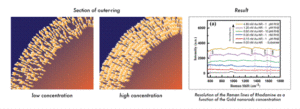 ये घने वलय संरचनाएं विशेष रूप से महत्वपूर्ण हैं। ये सैकड़ों “हॉट स्पॉट” बनाती हैं, जहां प्रकाश अत्यधिक तीव्र होता है। जब सूखे दाग पर लेजर की किरण डाली जाती है, तो सोने की छड़ों से जुड़े रोडामाइन बी अणु सामान्य से कहीं अधिक चमकीले प्रकाशीय संकेत उत्पन्न करते हैं। कम नैनोरॉड सांद्रता पर, रोडामाइन बी की केवल अपेक्षाकृत उच्च मात्रा (लगभग एक गिलास पानी में एक बूंद डाई के बराबर) का पता लगाया जा सका। लेकिन जैसे-जैसे नैनोरॉड की सांद्रता बढ़ी, पता लगाने की क्षमता में जबरदस्त सुधार हुआ। सबसे घने वलय जमाव के साथ, यह तकनीक रोडामाइन बी को एक ट्रिलियन में एक भाग तक की सांद्रता में पकड़ सकी। आश्चर्यजनक रूप से, नैनोरॉड सांद्रता में सौ गुना वृद्धि ने संवेदनशीलता को लगभग दस लाख गुना बढ़ा दिया।