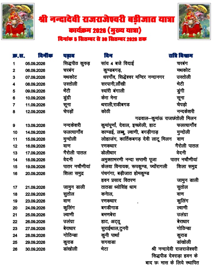 जारी कार्यक्रम के अनुसार, बधाण की नंदादेवी की बड़ी जात यात्रा 5 सितंबर को सिद्धपीठ कुरूड़ से प्रारंभ होगी और 30 सितंबर को नंदा सिद्धपीठ देवराड़ा (थराली) के मंदिर में उत्सव डोली के विराजमान होने के साथ विधिवत रूप से संपन्न होगी।