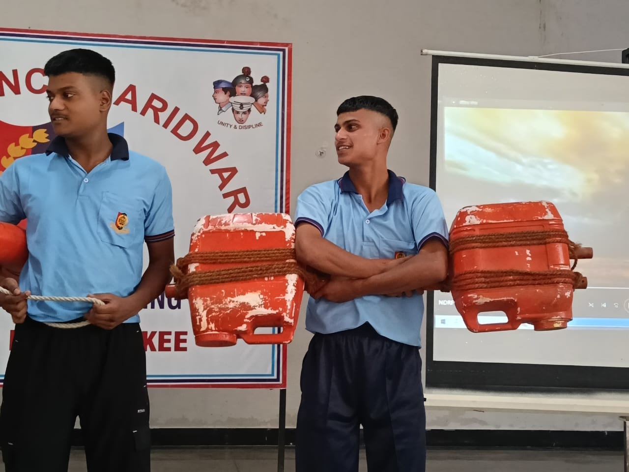 प्रशिक्षण के द्वितीय सत्र में एनडीआरएफ (NDRF) के इंस्पेक्टर दीपक ने कैडेट्स को बाढ़ से संबंधित खतरों, उनसे बचाव के उपायों और आपातकालीन स्थिति में किए जाने वाले प्राथमिक कदमों के बारे में विस्तार से बताया। उन्होंने सीमित संसाधनों में स्थानीय सामग्री— जैसे प्लास्टिक की बोतलें, बांस, रस्सी और ड्रम— से इम्प्रोवाइज्ड फ्लोटेशन डिवाइसेज़ (तैरने वाले उपकरण) बनाने की विधि सिखाई। एनडीआरएफ टीम ने इन उपकरणों का व्यावहारिक प्रदर्शन भी किया, जिससे कैडेट्स ने रेस्क्यू तकनीकों को प्रत्यक्ष रूप से देखा और सीखा।
