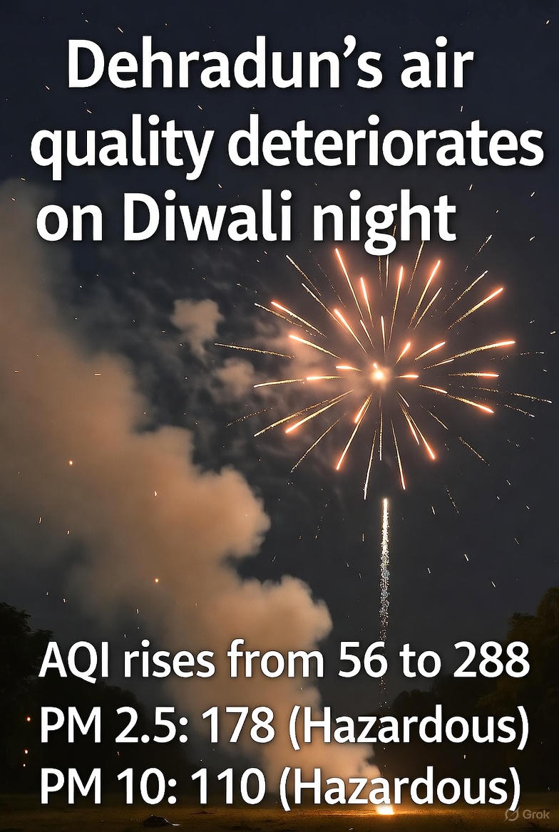 प्रदूषण नियंत्रण बोर्ड के आंकड़ों के अनुसार, दीपावली की रात से अगले दिन सुबह तक वायु गुणवत्ता लगातार बिगड़ती गई। रात 10 बजे जहां एक्यूआई 182 था, वहीं सुबह 8 बजे यह बढ़कर 276 तक पहुंच गया। सबसे ज्यादा वायु प्रदूषण दून विश्वविद्यालय क्षेत्र में दर्ज किया गया, जहां एक्यूआई 276 मापा गया।