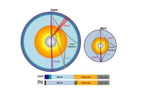 In cross-section, Mars appears as a scaled-down Earth, with proportional reductions in the inner core, outer core, and mantle.