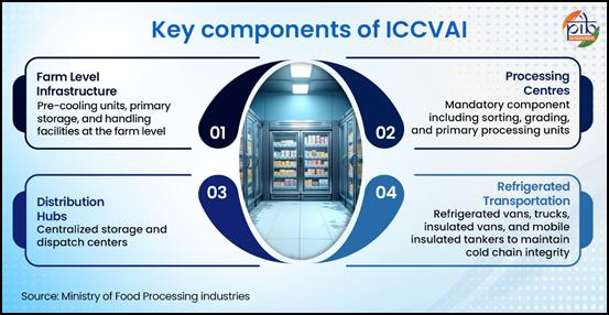 खाद्य प्रसंस्करण उद्योग मंत्रालय की एक पहल, आईसीसीवीएआई (एकीकृत शीत श्रृंखला और मूल्यवर्धन अवसंरचना) का मुख्य उद्देश्य, भारत की खाद्य आपूर्ति श्रृंखला को सुदृढ़ करना, गुणवत्ता में सुधार करना और किसानों की आय बढ़ाने पर ध्यान केंद्रित करना है। यह पहल इष्टतम तापमान बनाए रखने और नष्ट होने से बचाने के लिए खेत से उपभोक्ता तक एक एकीकृत कोल्ड चेन बनाने पर केंद्रित है, जिससे फसल कटाई के बाद के नुकसान को कम किया जा सके। वैज्ञानिक भंडारण और प्रसंस्करण के माध्यम से, यह ताजगी, पोषण और समग्र गुणवत्ता को बनाए रखने में मदद करता है।