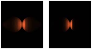 चित्र 1 : अगस्त 16.83 (बाएं स्तंभ) और 30.87 (दाएं स्तंभ), 2021 के लिए सर्वोत्तम अनुकूल किए गए त्रि-आयामी 3डी मॉर्फो- काईनेमेटिक मॉडल से प्राप्त आरएस ऑफ 2021 के उत्सर्जित द्रव्य ( इजेक्टा ) की मॉडल छवियां