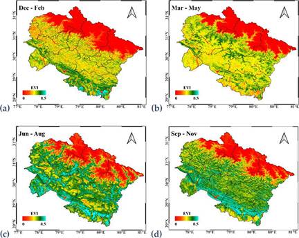 इस अध्ययन में उत्तराखंड में ईवीआई (एन्हांस्ड वेजिटेशन इंडेक्स; एनडीवीआई के समान लेकिन उच्च बायोमास वाले क्षेत्रों में बेहतर संवेदनशीलता के साथ) और जलवायु चर तथा उनके संबंधों का भी विश्लेषण किया गया।