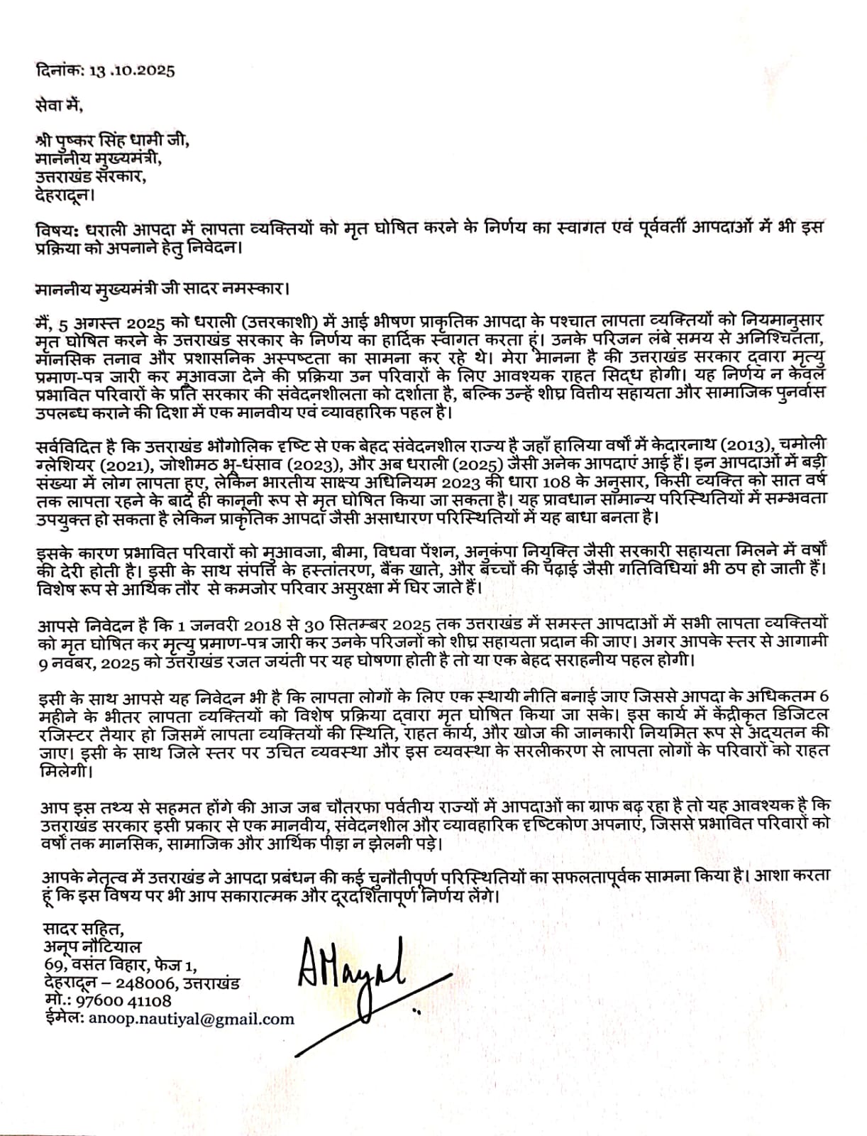 अपने पत्र में उन्होंने उल्लेख किया कि भारतीय साक्ष्य अधिनियम की धारा 108, जिसके अंतर्गत किसी व्यक्ति को सात वर्ष तक लापता रहने के बाद ही मृत घोषित किया जा सकता है, प्राकृतिक आपदाओं जैसी असाधारण परिस्थितियों में बाधक साबित होती है। उन्होंने कहा कि राज्य सरकार एक विशेष नीति बनाकर अधिकतम छह महीने के भीतर लापता व्यक्तियों को विशेष प्रक्रिया द्वारा मृत घोषित करने की व्यवस्था करे। उन्होंने यह भी प्रस्ताव रखा कि लापता व्यक्तियों का एक केंद्रीकृत डिजिटल रजिस्टर बनाया जाए, जिससे राहत कार्यों, खोजबीन और पुनर्वास की स्थिति नियमित रूप से अपडेट की जाए।