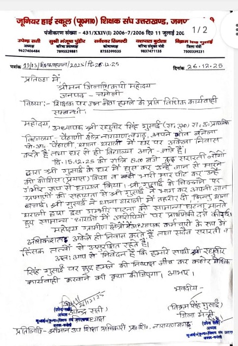 उन्होंने कहा कि वे घर पर अकेले रहते हैं जबकि उनका परिवार देहरादून में रहता है, ऐसे में उन्हें अतिरिक्त सुरक्षा की आवश्यकता है। उधर, जूनियर हाईस्कूल शिक्षक संगठन ने जिलाधिकारी चमोली को ज्ञापन सौंपकर आरोपितों पर कठोर विधिक कार्रवाई की मांग की है।