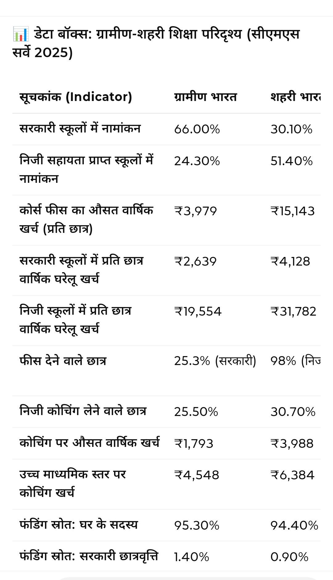 • ग्रामीण छात्र कोचिंग पर सालाना औसतन ₹1,793 खर्च करते हैं, जबकि शहरी छात्र लगभग ₹3,988।