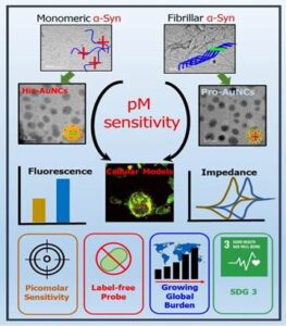 Fig: Gold nanocluster-based biosensor distinguishes between physiological and pathological α-synuclein conformers, enabling early-stage detection of Parkinson’s disease.