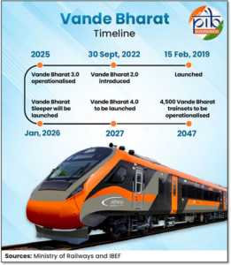 Vande Bharat is envisioned as a key pillar of India’s passenger rail modernisation in the coming decades. By 2047, the Vande Bharat fleet is envisioned to scale to around 4,500 trainsets, aligned with India’s long-term development goals. In the medium term, the focus is on scaling up services, operating about 800 Vande Bharat trainsets by 2030, subject to infrastructure readiness and manufacturing capacity.