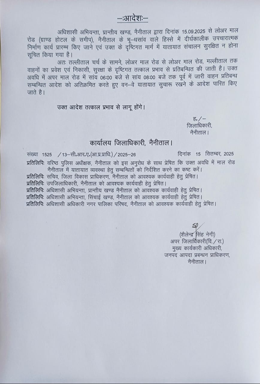 अपर  जिलाधिकारी नैनीताल शैलेन्द्र सिंह नेगी  द्वारा जारी आदेश के अनुसार तल्लीताल चर्च के सामने से लोअर माल रोड होते हुए मल्लीताल तक वाहनों का प्रवेश और निकासी तत्काल प्रभाव से प्रतिबंधित कर दी गई है। हालांकि सुबह के समय सुचारू यातायात को ध्यान में रखते हुए प्रतिदिन प्रातः 6 बजे से 8 बजे तक इस मार्ग पर वाहन संचालन की अनुमति दी जाएगी।