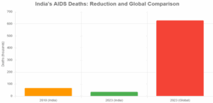 | 2010 में 1.73 लाख मृत्यु से 2024 में 32,200 तक 81.40% की कमी दर्ज की गई है। यह गिरावट 2025 तक एचआईवी के साथ रहने वाले 18 लाख से अधिक लोगों (PLHIV) को निःशुल्क एआरटी प्रदान करने, 94% एआरटी रिटेंशन और 97% वायरल सप्रेशन दर हासिल करने से संभव हुई है—ये वे प्रमुख तत्व हैं जो एचआईवी से एड्स की ओर बढ़ने की प्रक्रिया को रोकते हैं।2024 में वैश्विक मृत्यु आंकड़ा (6,30,000) भारत के 2024 के आंकड़े (32,200) की तुलना में बेहद अधिक है, जहाँ भारत का कुल योगदान वैश्विक बोझ का मात्र 5% है। यह अंतर भारत के बेहतर परिणामों को दर्शाता है, जो किफायती जेनेरिक दवा उत्पादन (वैश्विक एआरटी का 70% आपूर्ति) और समुदाय आधारित भागीदारी से प्रेरित हैं। भारत की उपलब्धियाँ वैश्विक कमी के रुझानों से आगे हैं और UNAIDS के 95-95-95 लक्ष्य के अनुरूप हैं |