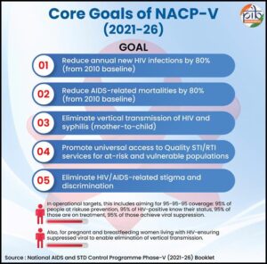 - राष्ट्रीय एड्स नियंत्रण कार्यक्रम (एनएसीपी) के माध्यम से प्रगति। भारत ने एनएसीपी चरणों में विकसित रणनीतियों के माध्यम से नए संक्रमणों को कम किया है और एआरटी तक पहुंच का विस्तार किया है।